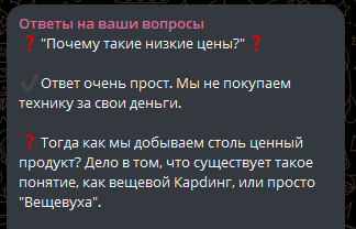 Низкие цены на товары объясняются использованием метода вещевого кардинга. То есть за границей определенные закупщики заказывают товар через интернет-магазины, оплачивают его. Далее продукция по проверенным каналам поступает в Россию, что позволяет сэкономить до 70% от стоимости. Потенциальным покупателям обещают, что техника придет новая, запакованная, с гарантиями от производителя.