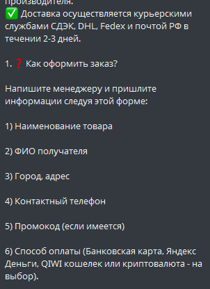 Подробная схема и условия продаж раскрыты в отдельном канале TehFAQ. Покупателям обещают прямые поставки из Европы и США, наличие треков для отслеживания посылок, скриншоты чеков и ордеров. Заявлено наличие дропа, отправка доступна в любой город России за 2-3 недели.