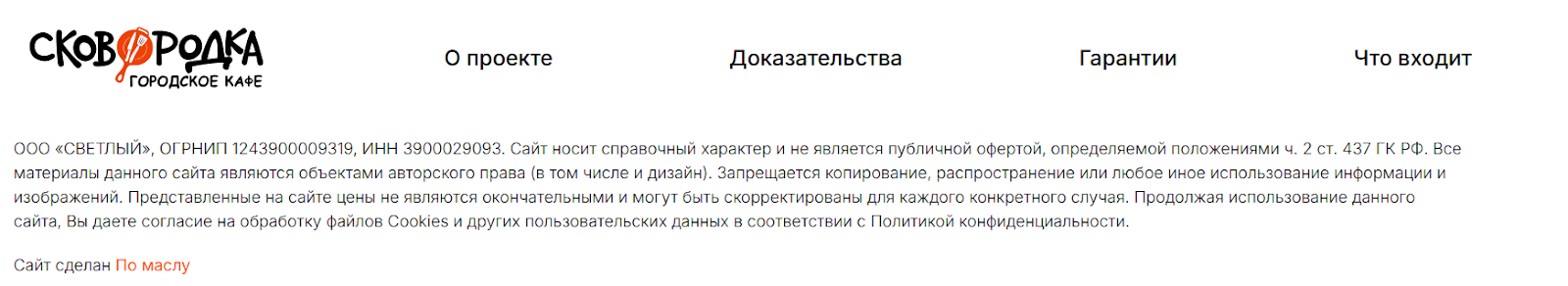 Кафе «Сковородка» работает в Калининграде. Деньги здесь привлекают за счет продажи долей в бизнесе. Юридически проект оформлен как ООО «Светлый» – компанию зарегистрировали в июле 2024 года. Возглавляет ее Созоник Сергей Сергеевич.