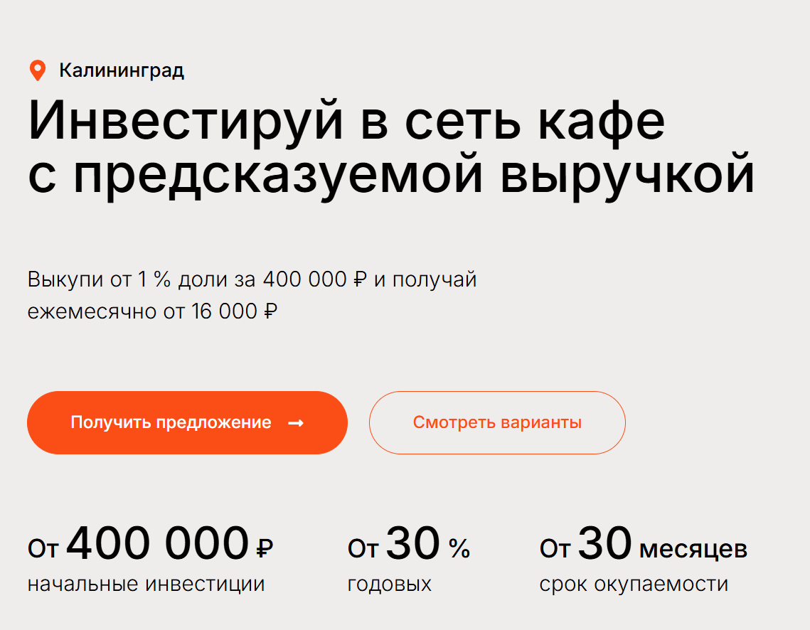 «Сковородка39» – это сеть кафе в Калининграде, куда приглашают вложить от 400 000 рублей в обмен на долю. Обещают доходность в 30-48% годовых. Прежде чем рассматривать такое предложение, стоит поискать отзывы об инвестициях в «Сковородку 39». В нашем обзоре разберемся, можно ли здесь рассчитывать на пассивный заработок.