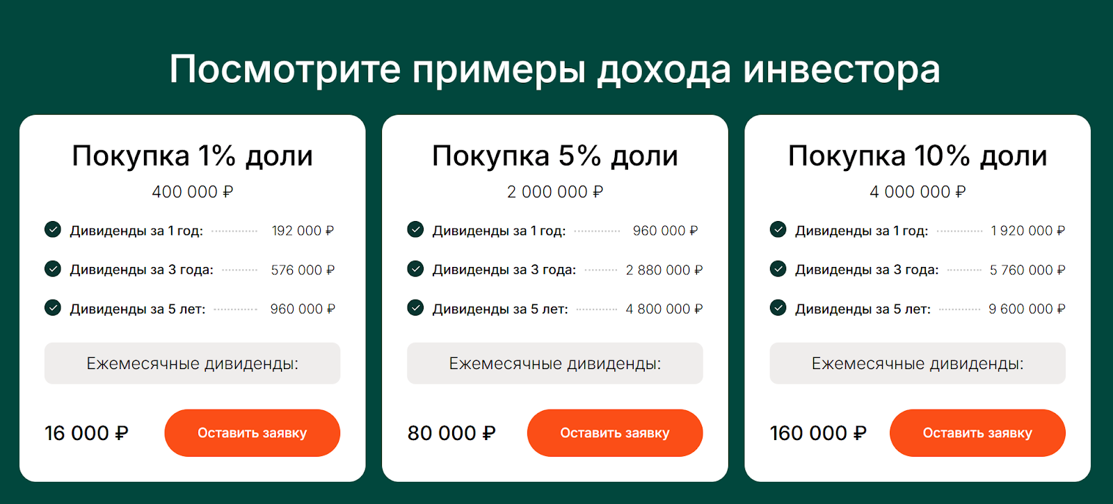 Инвесторам предлагают купить долю в уставном капитале ООО «Светлый». Минимальный вход – 400 000 рублей, это 1% доли. С нее ежемесячно выплачивают от 16 000 рублей. Если купить 5% за два миллиона рублей, то доход составит 80 000 рублей в месяц.