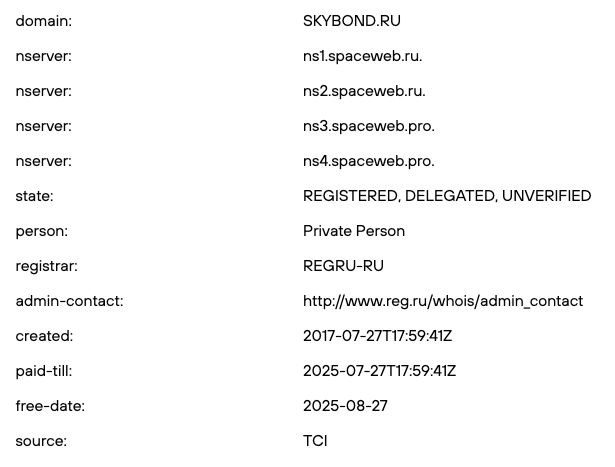 Чтобы убедиться в том, что компания действительно начала работу много лет назад, мы запросили информацию о доменном имени skybond ru из сервиса Whois. Выяснили, что он был выдан регистратором в июле 2017-го года.