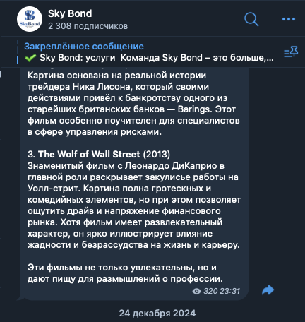 На телеграмм-канал Sky Bond, skybond, на 8 января 2025-го года, подписано около 2,3 тысяч пользователей. Публикации просматривают в среднем 300-400 раз.
