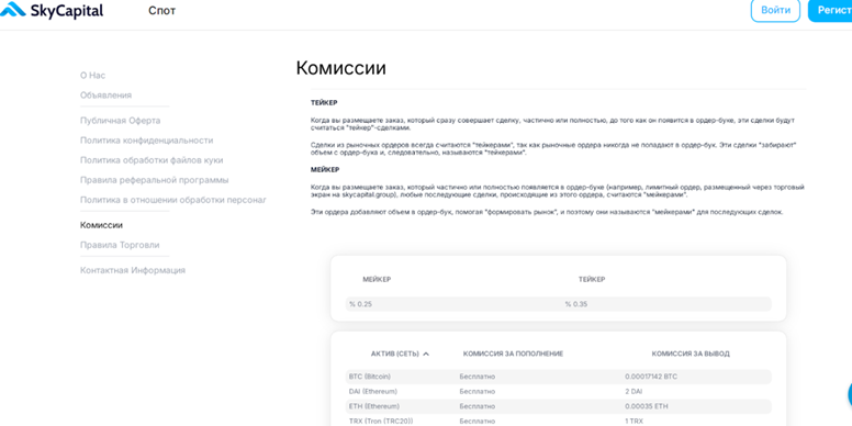 «Скайкэпитал» назначил комиссию 0,25% за мейкер и 0,35% за тейкер. По реферальной программе платят доход 25% в месяц. Это правила для всех пользователей, которые работают на площадке. Все указанные моменты указаны на сайте.