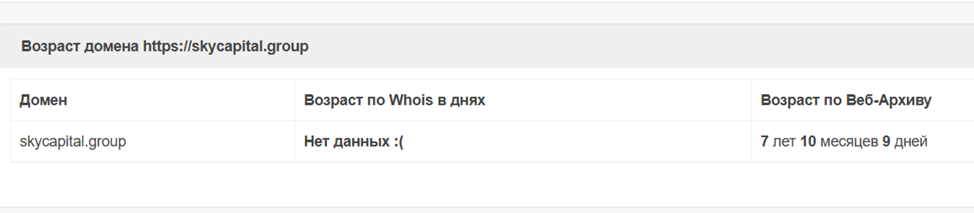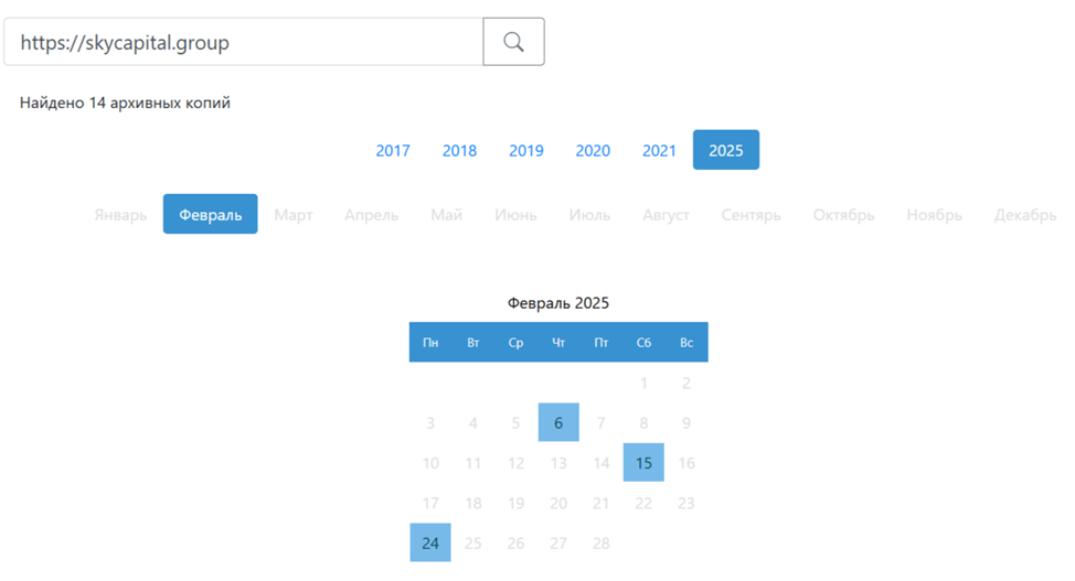 Домен «Скайкэпитал» зарегистрирован более 7 лет назад, но представленному обменнику он перешел в 2025 году. Это показала внимательная проверка архива, где хранится вся информация по разным сайтам.