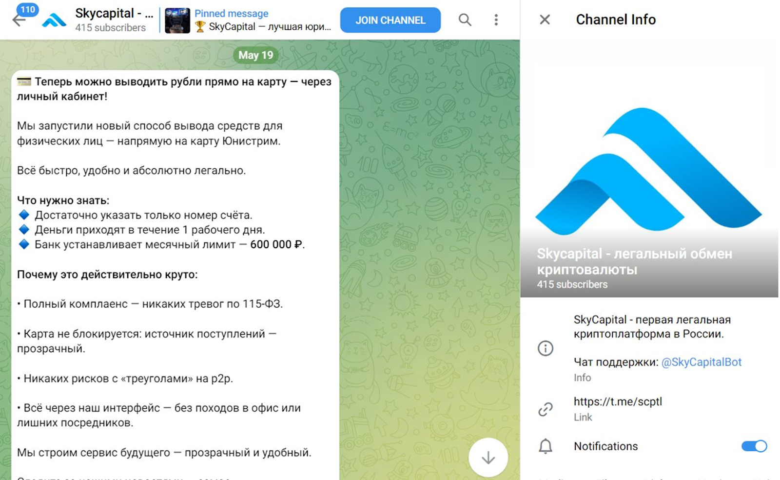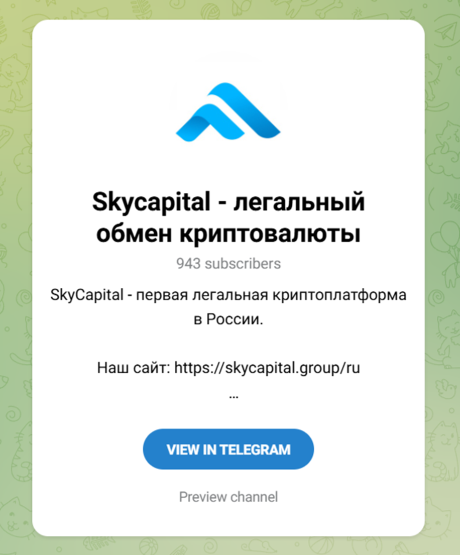 Тг-канал «Скайкэпитал» функционирует с февраля 2025. И сегодня там свыше 900 подписчиков. Там публикуются сведения об изменениях в работе и преимуществах. Отзывы о площадке не размещаются. Регулярно публикуются посты о мероприятиях по блокчейну в Москве.