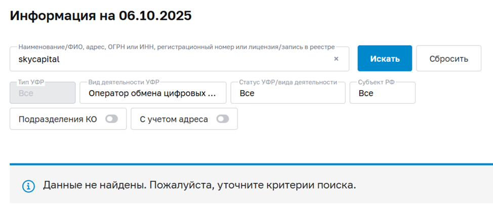 Но ситуация с обменником не такая простая. У него есть и ряд недостатков, о которых умалчивают. Разоблачение Sky Capital помогло выяснить несколько интересных моментов. У обменника нет лицензии, что показала проверка реестра ЦБ РФ. Поэтому деятельность площадки незаконная.