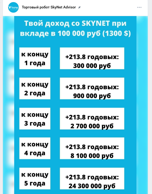 Из опубликованной информации, бета-тестирование SkyNet Advisor началось в марте 2025 года. Тогда создатели объявили о том, что программа без участия клиента будет совершать сделки. Пользователей уверяют в том, что в проект встроены умные механизмы, и риски минимальные. Основатели в соцсетях разместили примерный размер прибыли с помощью программы. При вкладе в 100 000 рублей пользователи якобы получат: