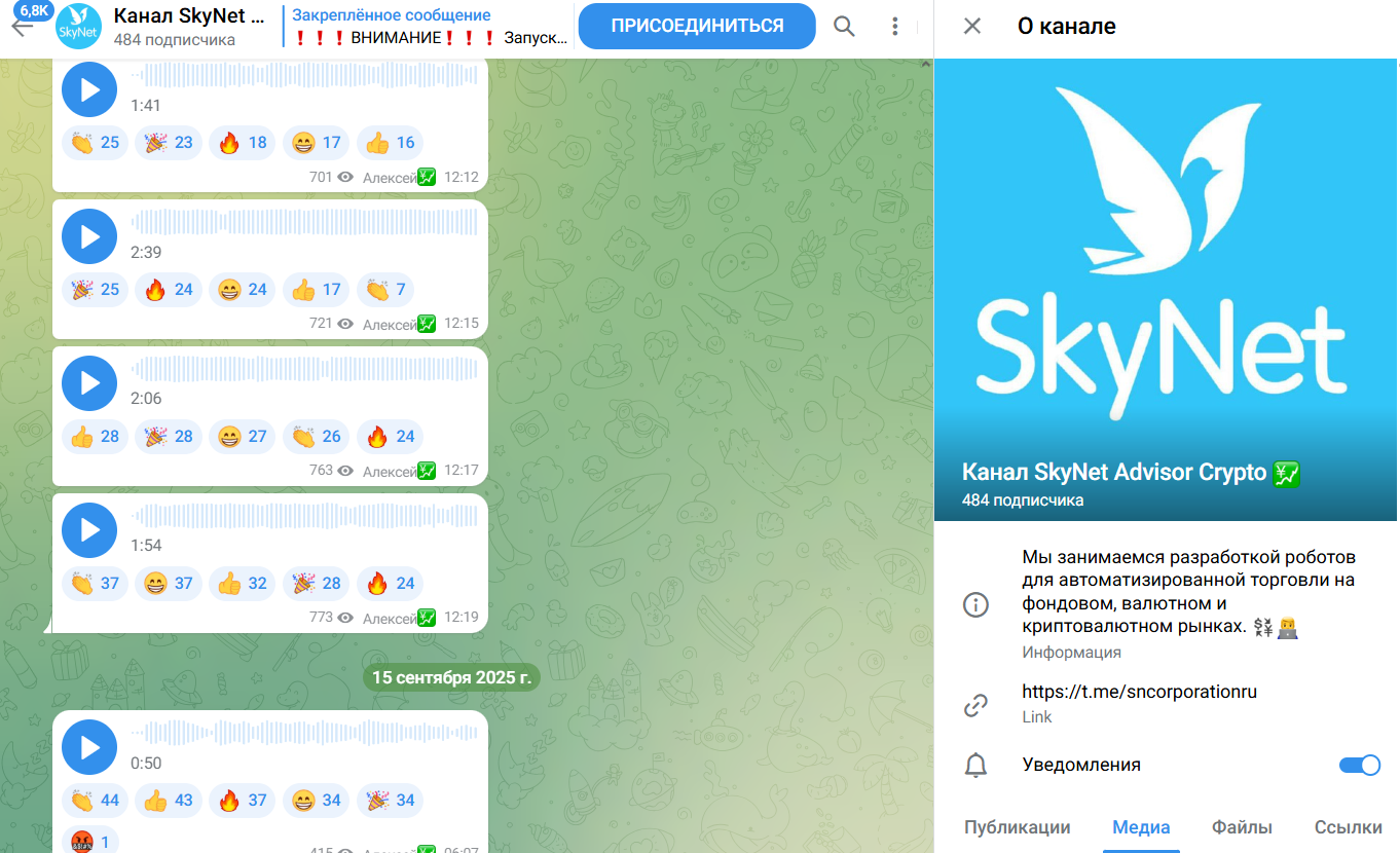 Телеграмм-канал SkyNet Advisor Crypto начал функционировать с 2022 года, и у него более 400 подписчиков.