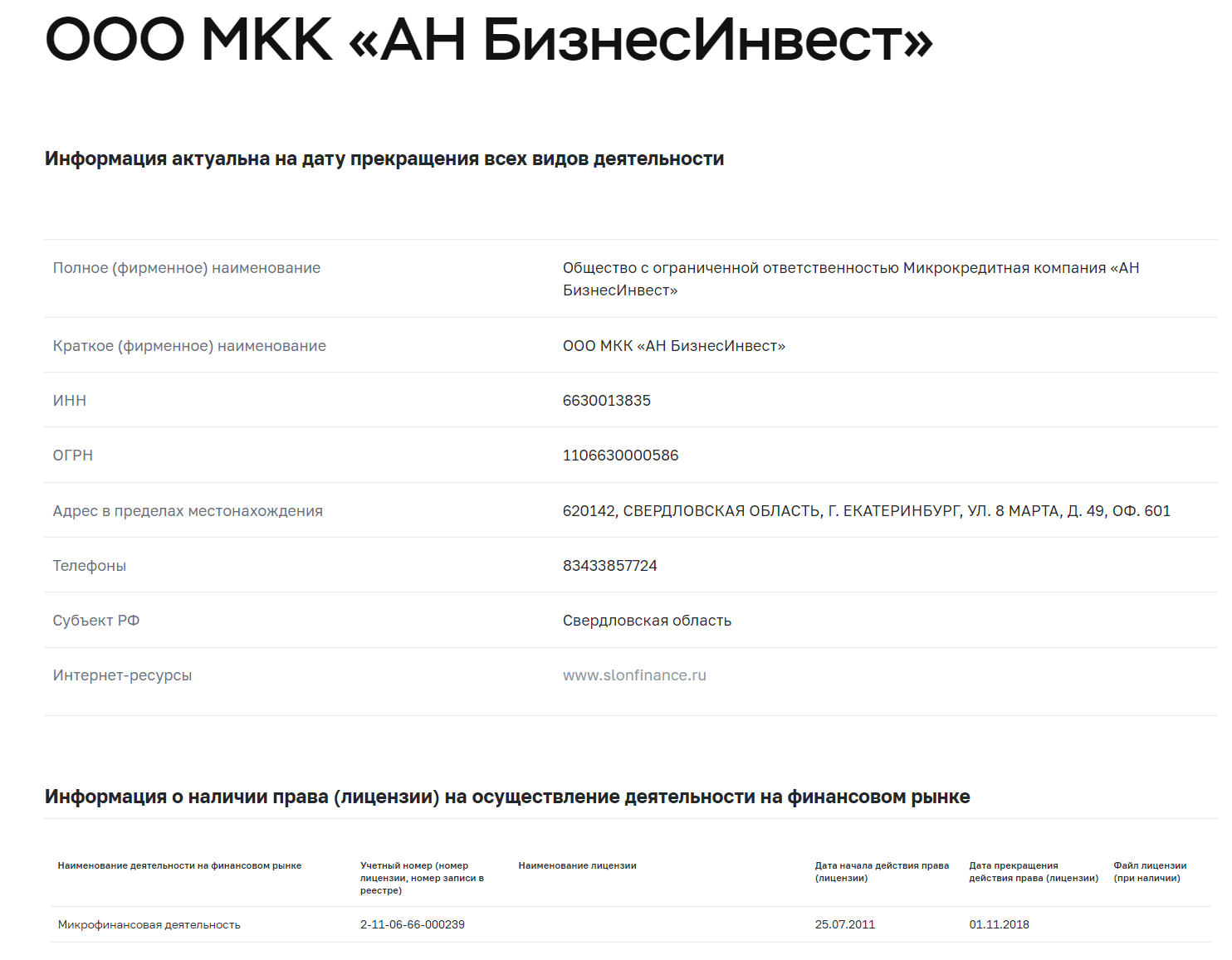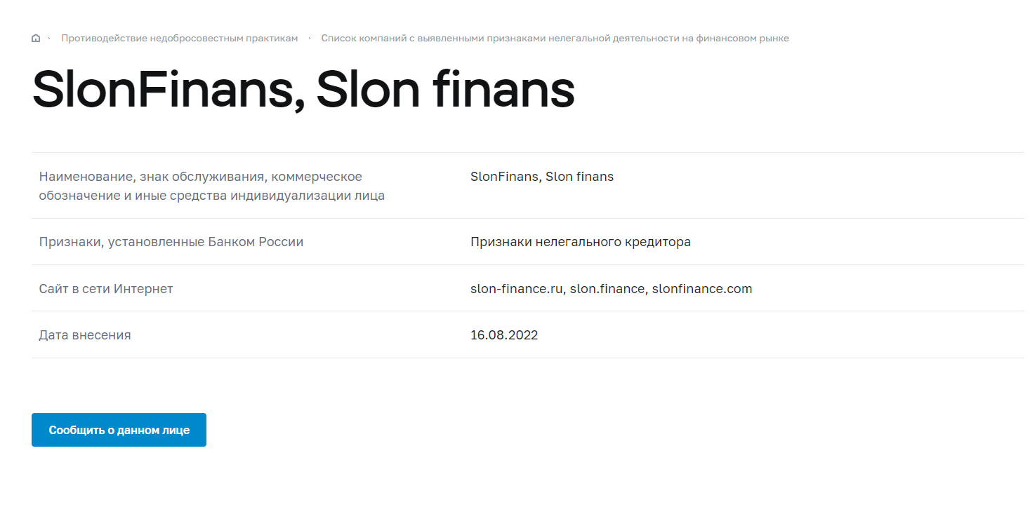 Если попытаться найти на сайте ЦБ информацию о наличии лицензии у Слон Финанс, то станет понятно, что МКК работает без нее уже 6 лет и все еще пытается выдавать займы. При этом название у ООО совсем другое, но сайт тот же (который уже не работает):