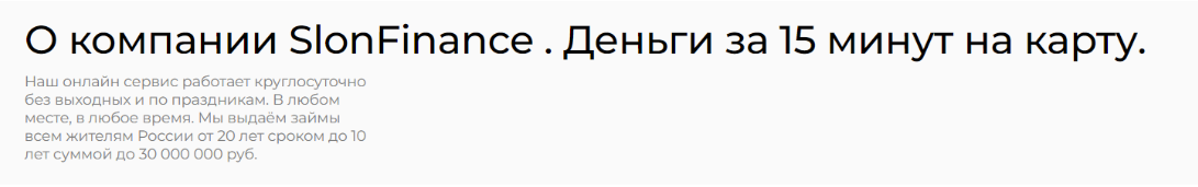 Slon Finance ru – домен, который перестал существовать. Сейчас сайт компании переехал в доменную зону .com. В МФО можно получить от 3 000 до 30 000 рублей на срок от 5 до 30 дней. Так, по крайней мере, говорит стандартный для многих МФО калькулятор на главной. При этом процентная ставка не меняется.
