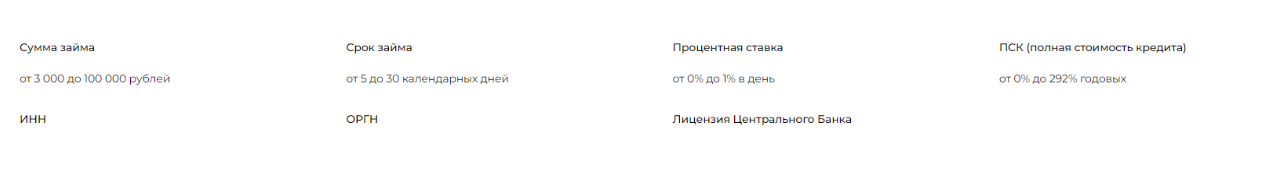 В разделе «О Нас» присутствует другая информация по выдаваемым займам: