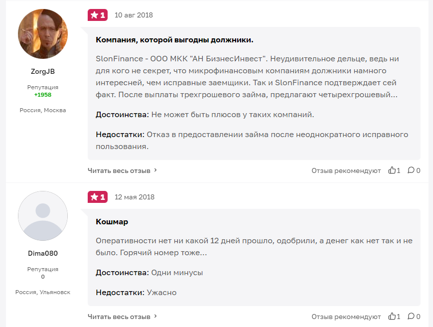 В целом отзывы на Слонфинанс ру указывают на то, что компания, похоже уже и не работает: