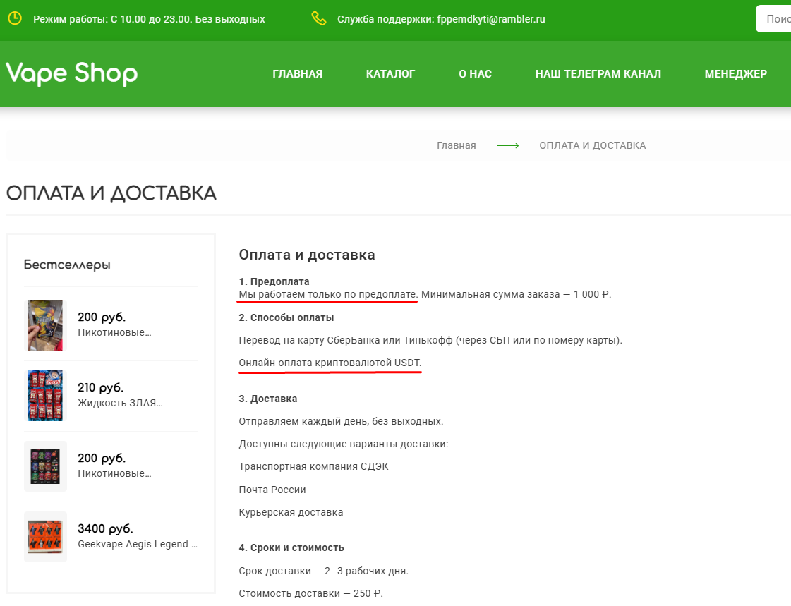 О самой компании нет вообще никаких сведений: неизвестно, кто владелец, где офис, есть ли склады. Все максимально закрыто и анонимно. Ну и самый подозрительный момент — SM24OPT работает только по 100% предоплате и принимает криптовалюту USDT, что прямо запрещено законом №259–ФЗ, который регулирует оборот цифровых активов.