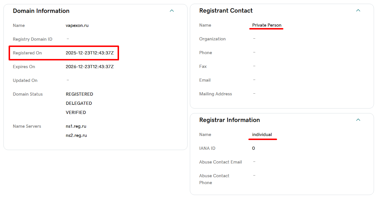 Проверка на сервисе WHOIS домена сайта Vapexon Ru , показала, что он был зарегистрирован 23 декабря 2025 года. На момент написания обзора домену было всего два дня — это типичный признак новодела. При этом URL оформлен на частное лицо, без указания какой-либо юридической информации.