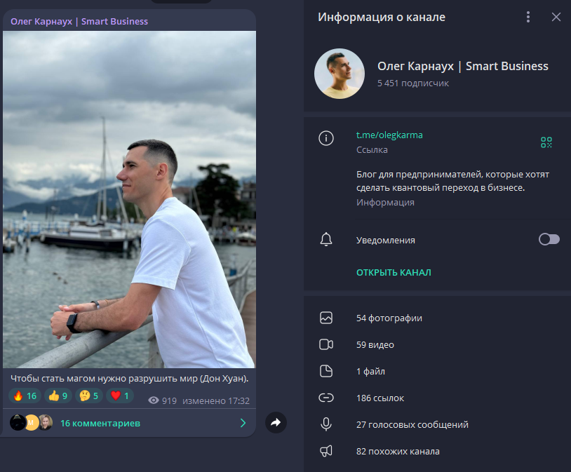 Мы уже перечислили, какие соцсети имеет коуч. Однако, стоит также подметить, что количество просмотров на всех соцсетях слишком низкое для такого количества подписчиков.Стоит также обратить внимание и на телеграмм-канал с отзывами. Восторженные отзывы Олега Карнауха попадают в канал редко.