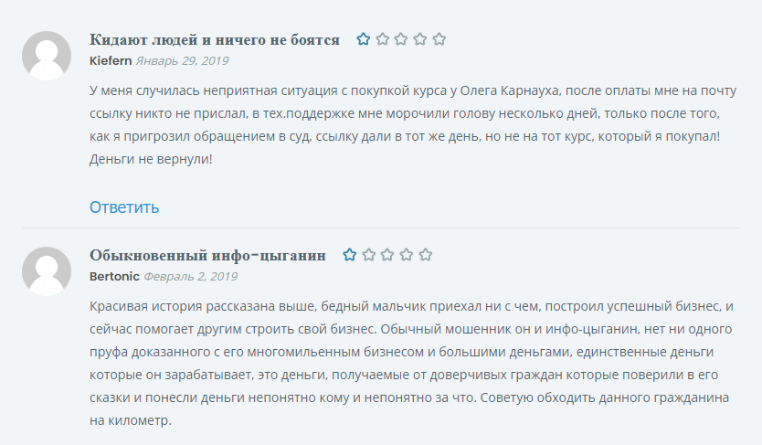 Когда мы начали искать отзывы о коуче в интернете, натыкались на множество статей и сайтов с заголовками “Олег Карнаух отзывы развод”. О проекте Олега Карнауха “маркетплейсы” абсолютно разные отзывы в интернете. Конечно, большинство отзывов покупные, однако невооруженный взгляд или простой новичок ничего бы не заподозрил.