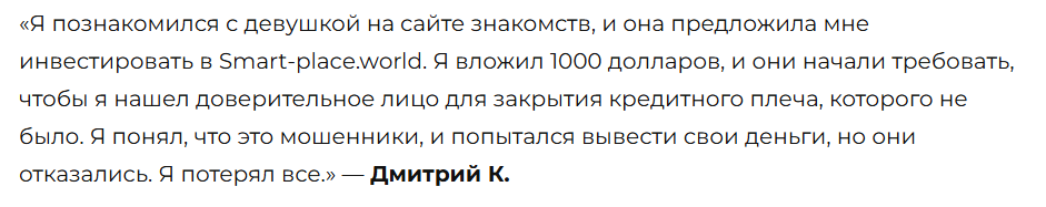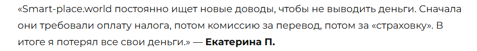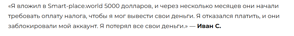 - В интернете большинство комментариев о платформе негативные, сообщается о невозможности вывести деньги и последующей блокировке аккаунтов клиентов, следовательно, негативное впечатление о бирже Smart Place World подтверждается.