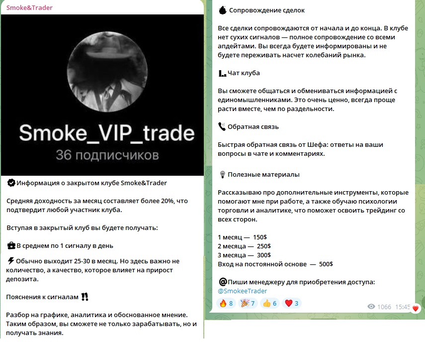 Обещанная ежемесячная доходность — не менее 20%. Для вступления нужно связаться с менеджером @SmokeeTrader. Каких-либо отчетов по работе клуба и результатам учеников владелец не дает