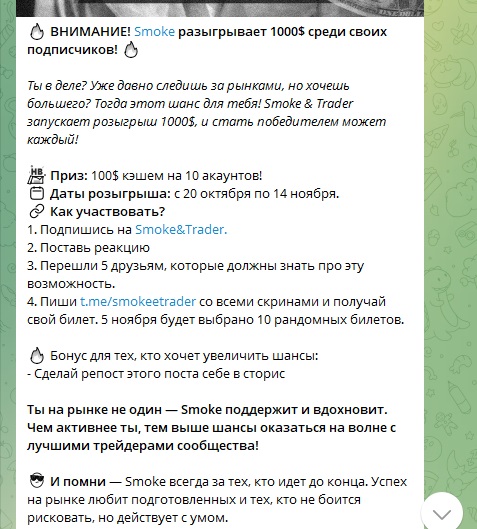 Канал стартовал в Телеграм в сентябре 2024 года, на него подписано 5,1 тыс. человек, публикации читает около тысячи. Чтобы быстро увеличить аудиторию, в октябре владелец объявил розыгрыш 1000$ — 10 победителей по 100$. Главное условие — подписаться на канал и привести 5 друзей. Это был маркетинговый трюк, победители не были выбраны, призы никто не выплатил.