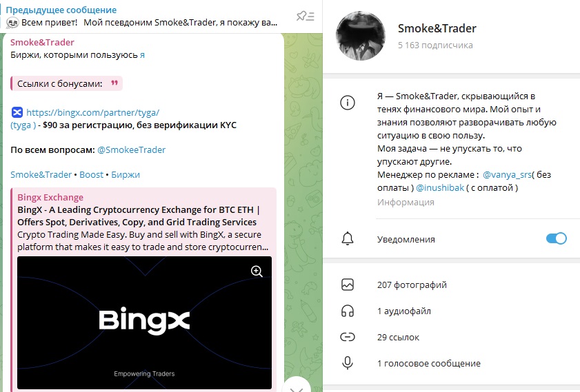 Админ работает под ником Smoke trader @SmokeeTrader, кроме того, есть два менеджера, которые занимаются вопросами рекламы — Andrew @inushibak и Magic @vanya srs