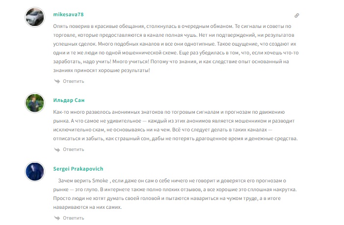 В сети пока очень мало отзывов о деятельности SmokeTrader, видимо, никто не спешит покупать подписки и пользоваться его услугами. Те, что мы нашли, только негативные — пользователи жалуются на низкое качество сигналов, как бесплатных, так и клубных.