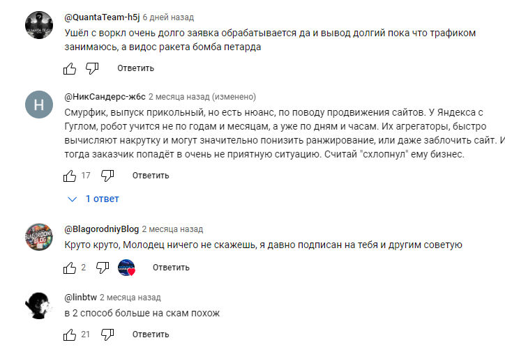 С одной стороны, посетители высказывают одобрение по поводу предложенных методов «заработка». Но с другой, разоблачают некоторые из них. Например, люди пишут о том, что алгоритмы сейчас быстро обучаются и легко вычисляют накрутку трафика. Ряд способов от Smurf Projects и вовсе называют скамом.
