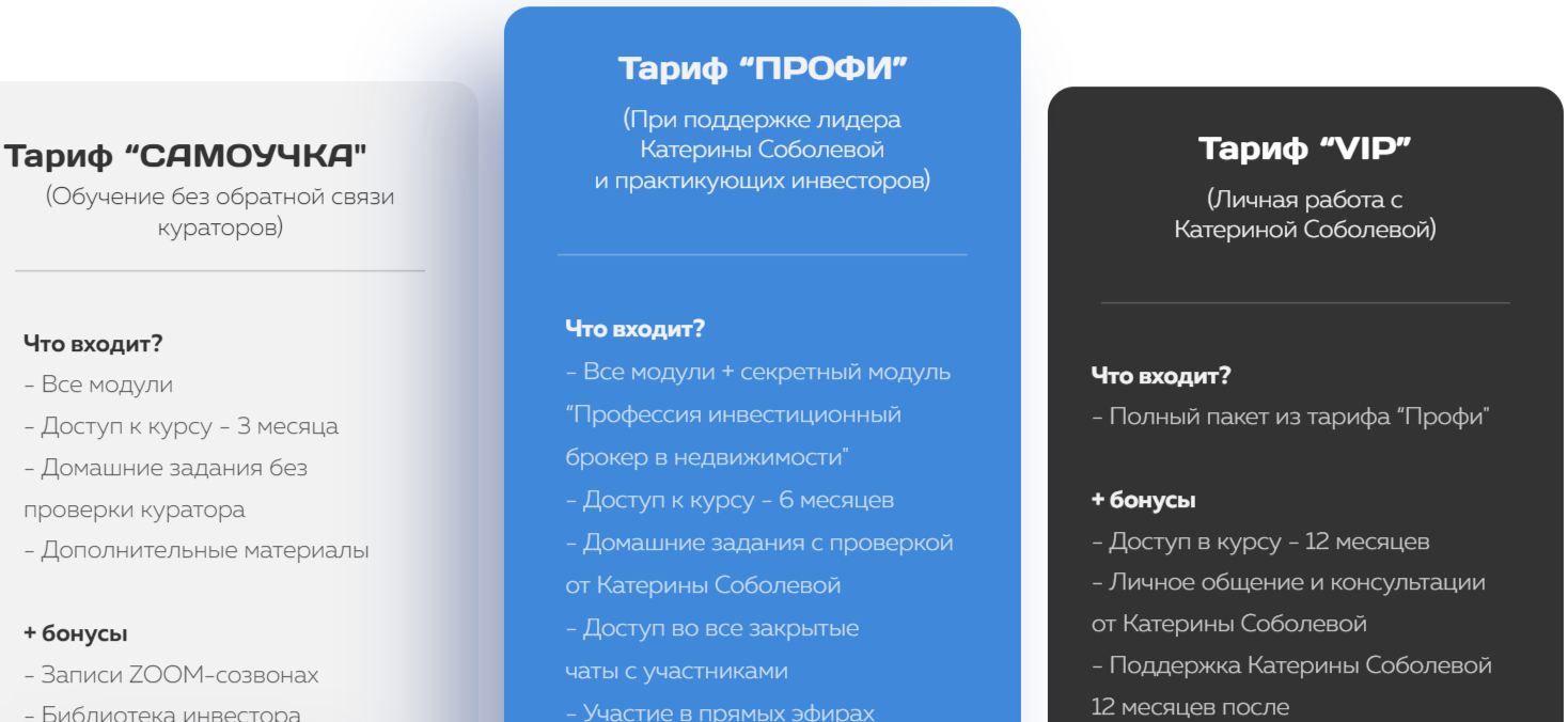 Обучение «Инвестируй в кайф с Соболевой» проходит в закрытом формате. Все три направления платные, но стоимость на сайте не указана. Бесплатных услуг не предусмотрено. Отличаются инвестиционные дальнейшим доступом к обучению и особыми условиями, из которых следует выделить: