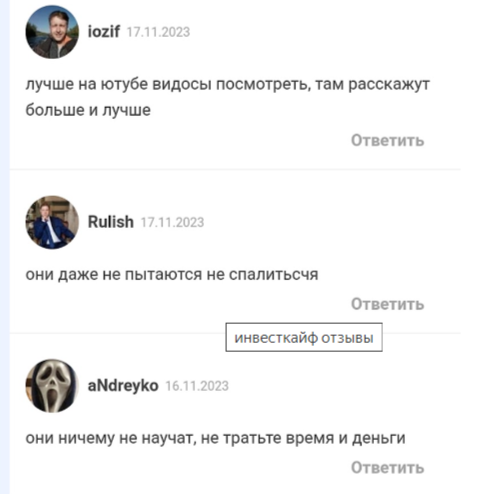 Здесь мы видим, что люди не довольны обучением «Инвест Кайф». Они жалуются, что зря потратили деньги, что обучение не принесло им никакой пользы, они не смогли воспользоваться полученными знаниями и получить обещанный доход.