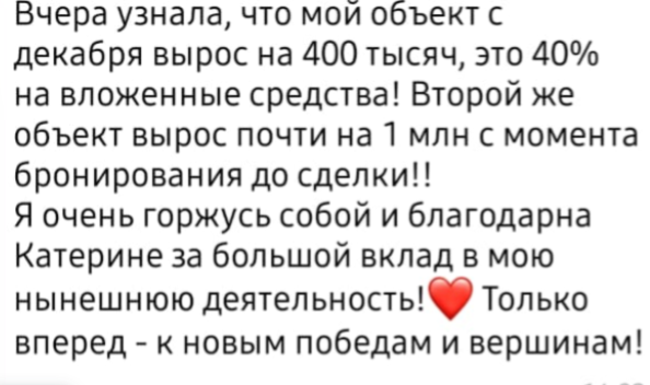 Как обещает Катерина, покупая и продавая недвижимость, можно получать прибыль ежемесячно до миллиона. Следуя советам автора проекта, зарабатывать клиенты смогут не только на российском рынке, но и на рынке США и ОАЭ.