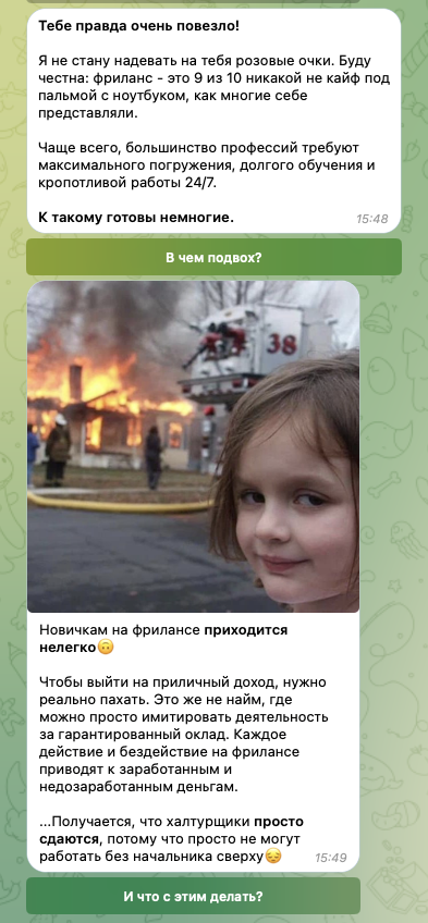 После активации бота в него начинают активно приходить сообщения о том, как это тяжело искать работу на фрилансе и получать за выполненные задания достойную оплату. В общем, давит на боль всех новичков-удаленщиков.