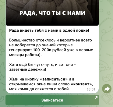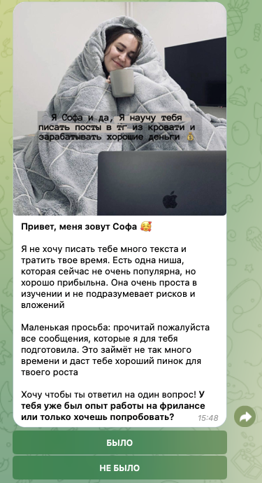 У Софы есть бот в Телеграмме, который находится по адресу sofa content bot. Через него она продвигает курс, на котором обещает дать знания о том, как выйти на доход в 100-200 тысяч рублей в месяц уже через квартал или даже меньший срок.