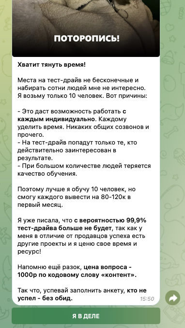 Затем же она предлагает решение, которое состоит в записи на тест-драйв ее обучения. Стоимость этой услуги составляет 1000 рублей. Данное коммерческое предложение содержит информацию о том, что Софа готова взять только 10 человек. После этого грозится закрыть тест-драйв.