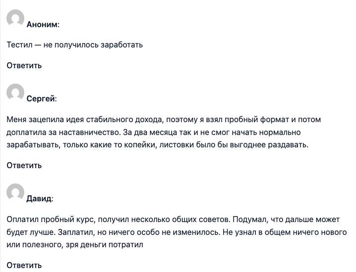 Авторы этих ревью утверждают, что тест-драйв обучения от Софы Высотиной является бесполезным и предназначен исключительно для прогрева потенциальных клиентов. Прошедшие полноценный курс заявляют, что в течение двух месяцев после его завершения так и не смогли найти работу с достойной оплатой.