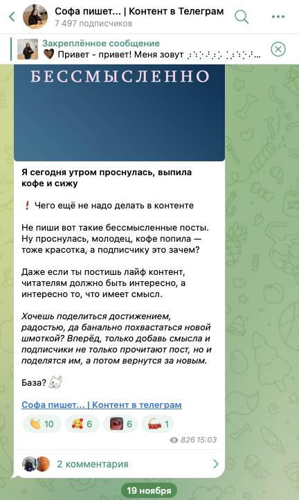 - контент Софы на ее тг-канале фактически бессмысленный и бесполезный;