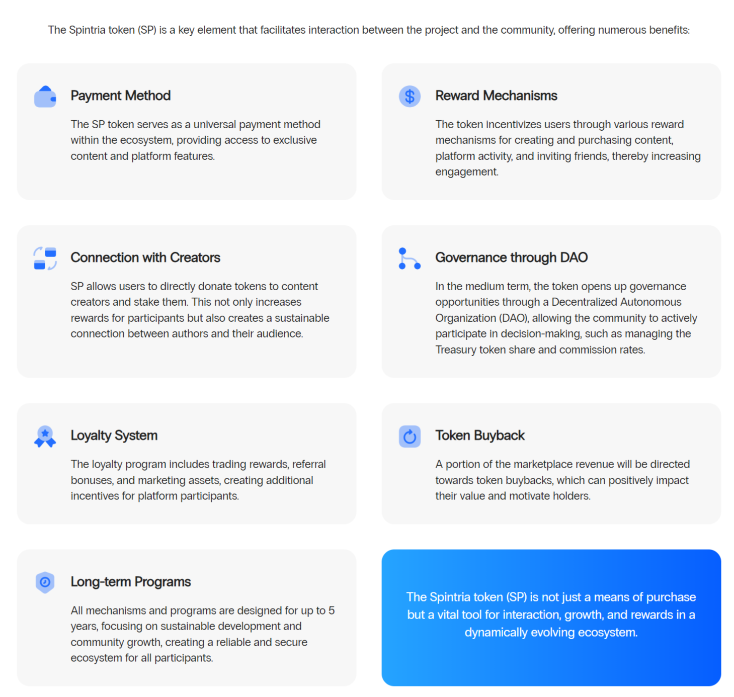 Sp token применяется как средство платежа с последующим получением вознаграждения за активную деятельность внутри экосистемы. Также к основным плюсам крипты Спинтриа относятся следующие: