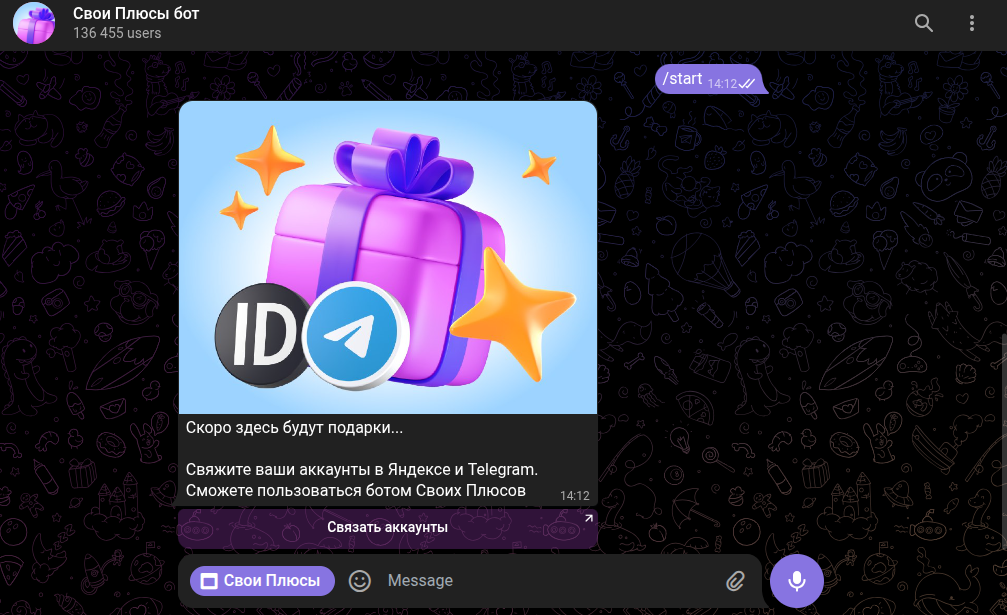 На данный момент бот уже не открывается. Алгоритм telegram, скорее всего, удалил ТГ бот «Свои Плюсы», так как он не имеет никакого отношения к поисковой системе «Яндекс».
