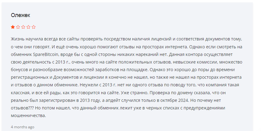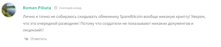 В интернете можно найти множество негативных комментариев про sparebitcoin com и работу обменника. Клиент по имени Олежек оставил длинный отзыв, в котором указывает, что с 2013 года ему не удалось найти никакой информации о сервисе, включая лицензии и владельцев.