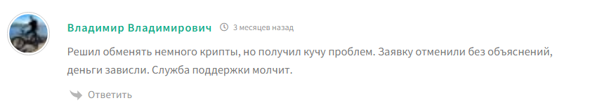 Еще один клиент по имени Владимир Владимирович поделился своим опытом работы с данным сервисом. Он пожаловался, что хотел обменять крипту, но заявку отменили, деньги получены не были, а техподдержка не отвечает.