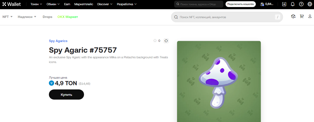 Spy Agaric можно приобрести на TON‑маркетплейсах. Минимальная цена Spy Agaric – 4,9 TON. Коллекция состоит из нескольких десятков тысяч экземпляров, доступных для обмена общей стоимостью около 33,63 тысяч TON. Количество держателей достигает 1,47 тысяч.