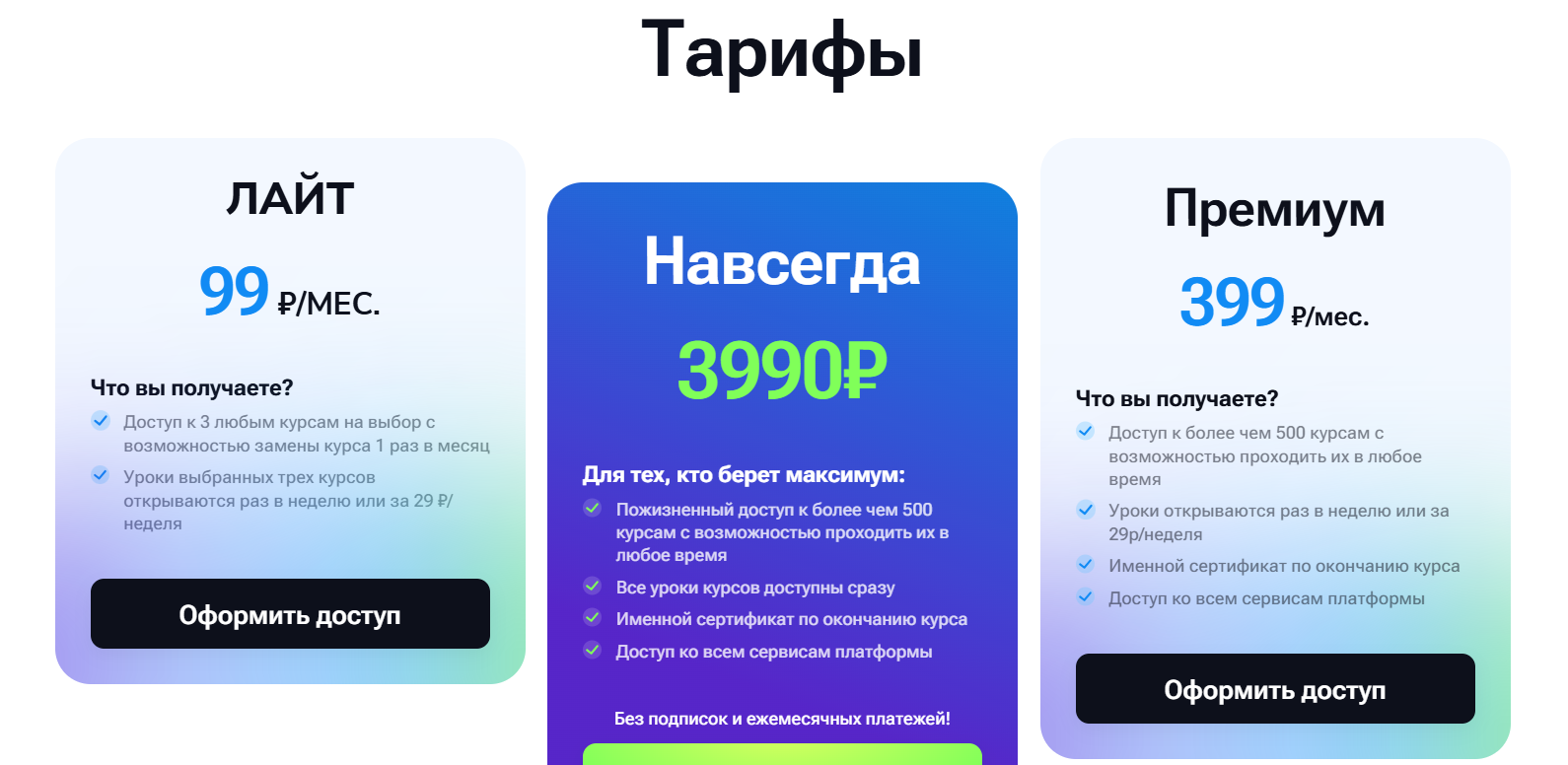 - “Лайт”. Можно получить доступ к 3 любым курсам, и открывать их можно 1 раз в неделю (далее платить 29 рублей). Стоит подписка 99 рублей в месяц;