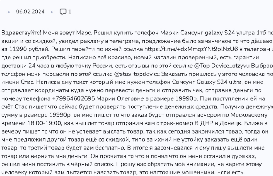 Отзывы о телеграм-канале Stanislav top store в сети не встречаются, но зато есть отклики о прежнем магазине Стаса – TopDevice Samsung. Найти среди них положительные не удалось. Покупатели пишут, что продавец обманывает клиентов, забирая предоплату.