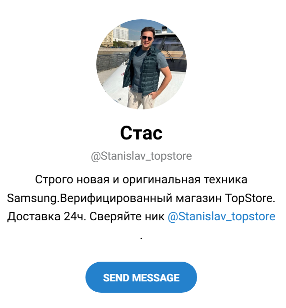 Стас (Stanislav topstore) – продавец в телеграм-канале TopStore. Предлагает оригинальную технику бренда «Самсунг» по низким ценам. Но репутация у него плохая. Подробнее расскажем далее.