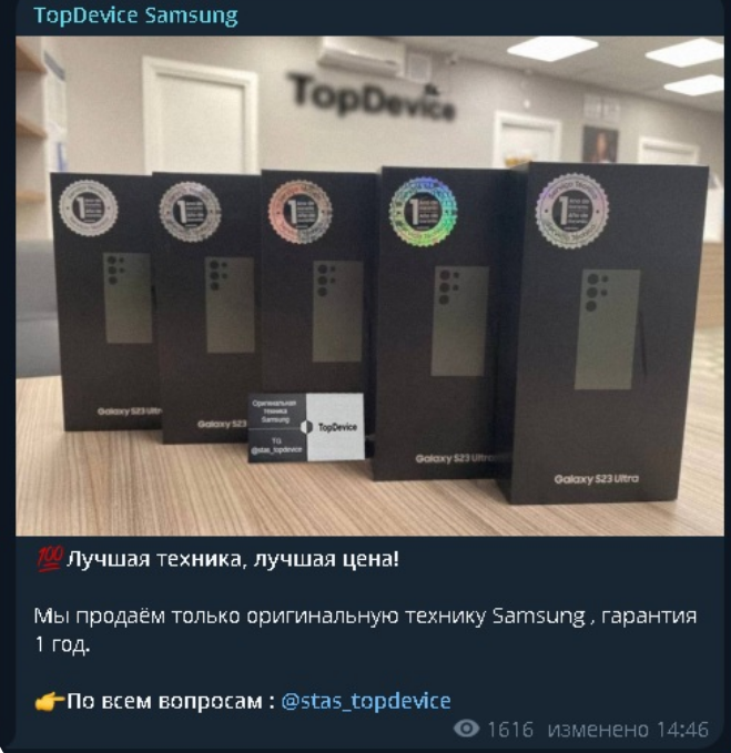 Стас (ник Stanislav topstore в TG) утверждает, что является представителем магазина электронной техники TopStore в Телеграме, где представлен бренд Samsung. На момент написания обзора найти такой канал в ТГ не удалось. Но мы узнали, что ранее его магазин назывался иначе – TopDevice Samsung, и ник у продавца был другой – Stas TopDevice.
