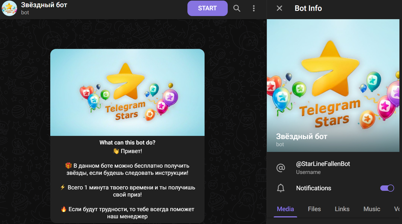 - на основании изученных данных, Starlinefallenbot может работать как скам;