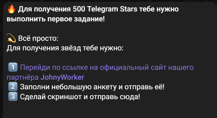На момент написания расценка на полтысячи звезд в самом Telegram составляет 829 руб., на сторонних ресурсах цена может варьировать в меньшую и большую сторону на несколько сотен в зависимости от деталей покупки. Руководители бота утверждают, что именно такое количество звезд они перечислят клиенту за простое задание – нужно перейти на сайт партнера, заполнить небольшую анкету и отправить ее, а также сделать скриншот и переслать его в бот. Достаточно простые действия для указанного заработка.Необходимые данные в анкете действительно минимальные, поэтому пользователю стоит внимательно проанализировать цены на рынке и задаться вопросом: зачем кому-то платить завышенный прайс за простую задачу.