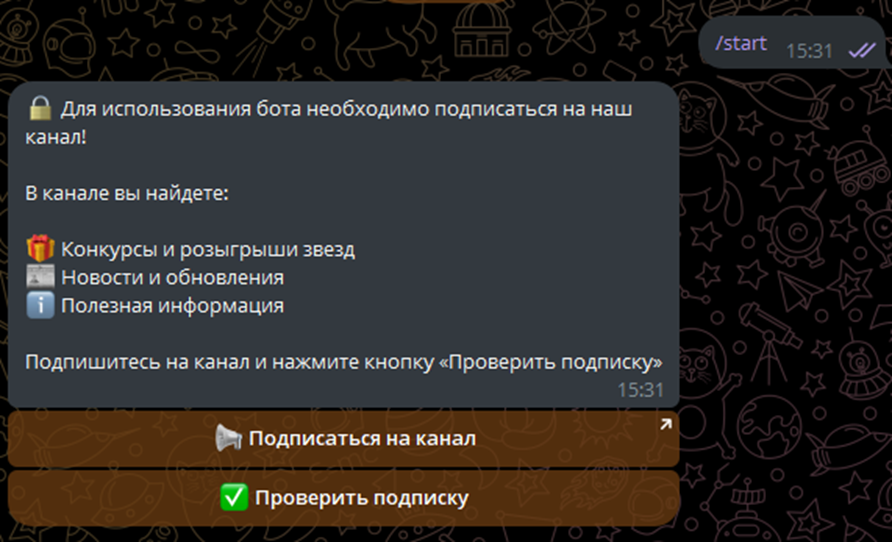 Но сразу начать работать с программой не получится. Чтобы получить доступ, требуется подписаться на новостной канал. Без этого бот не открывается. После оформления подписки пользователям обещают такие возможности: