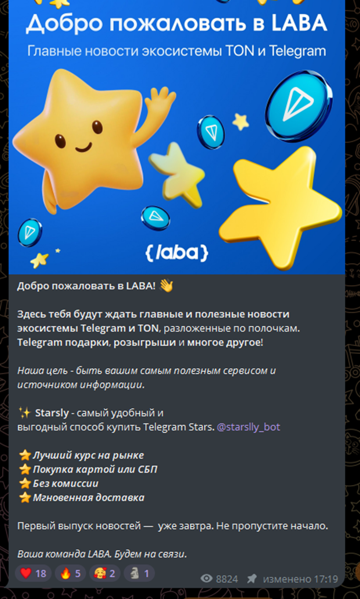 В описании канала сказано, что он является официальным ресурсом бота Starsly, который также занимается продажей звезд ТГ. Пользователям обещают курсы, которые на 30% ниже рыночных, отсутствие комиссий, мгновенное зачисление. Оплата звезд доступна через карты или систему СБП.