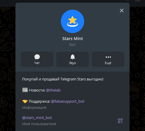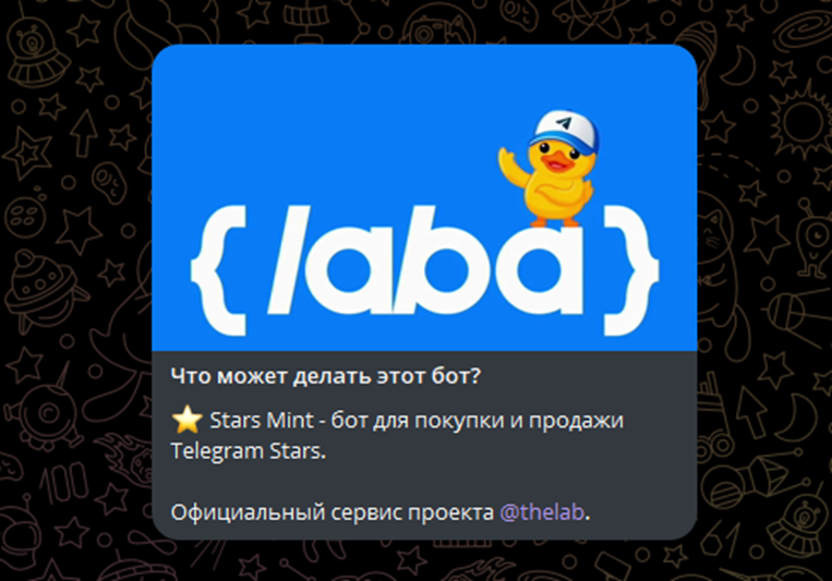 Мини-приложение Старс Минт создано специально для простой продажи или покупки звезд ТГ. Владельцем бота указан проект LABA, актуальные новости о работе программы и обновления можно узнать на новостном канале TheLab.