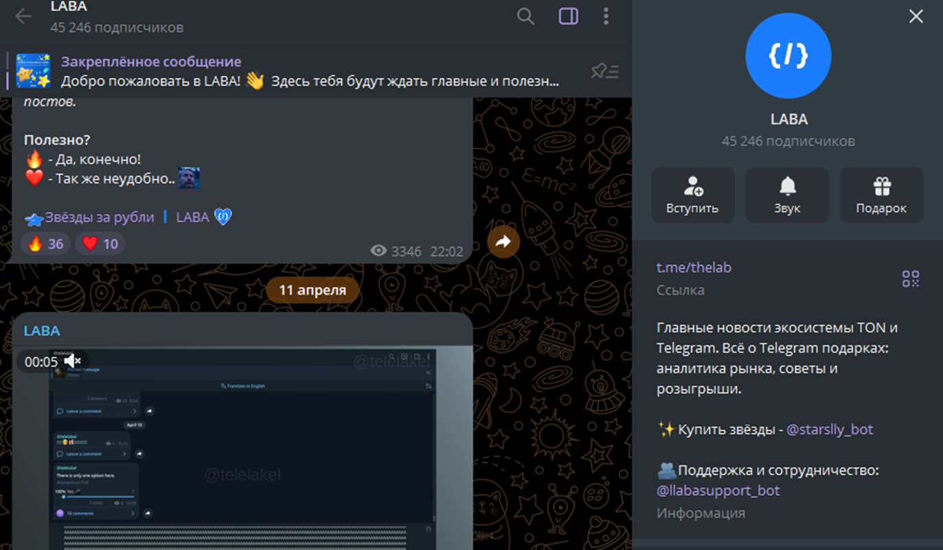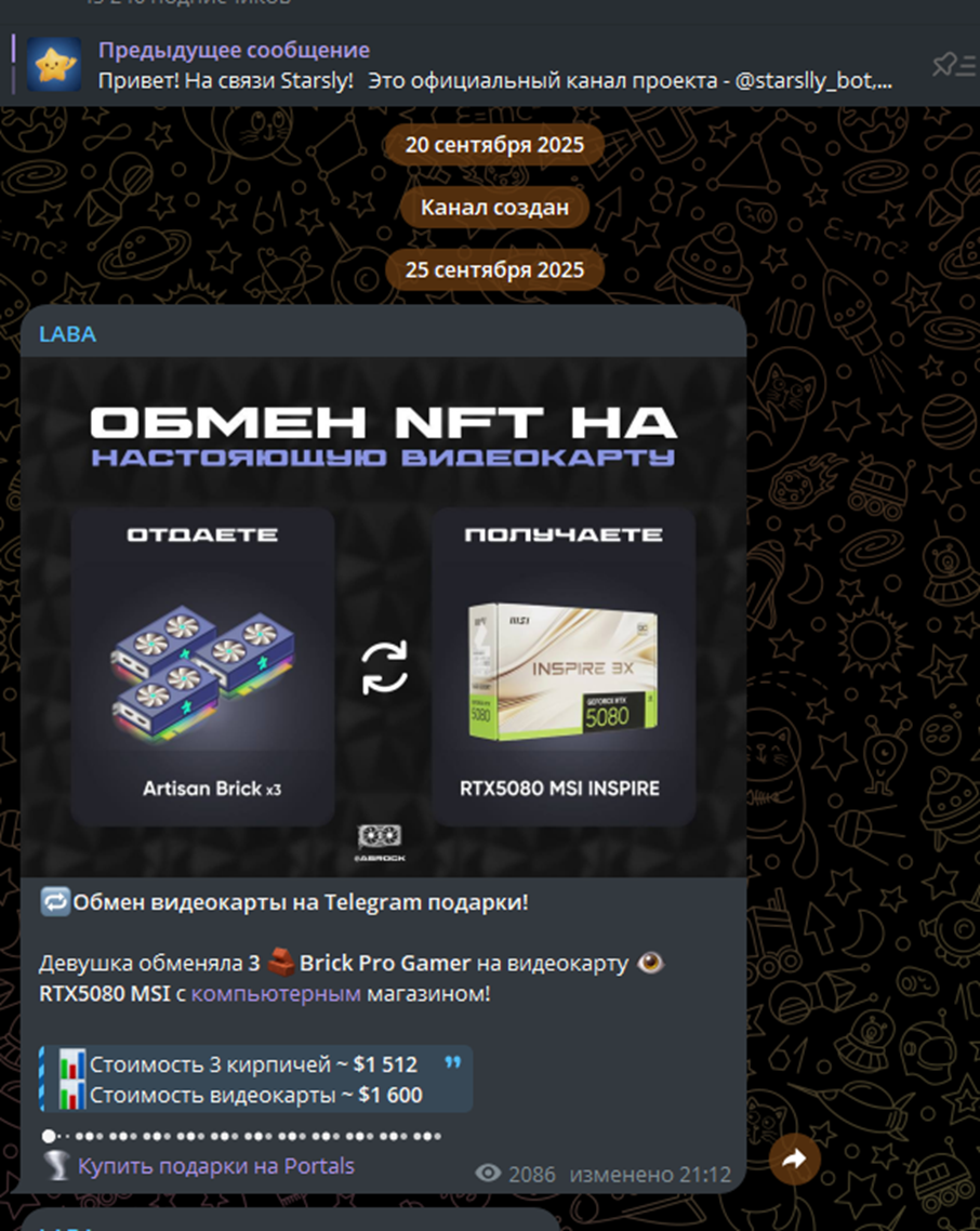При переходе на новостной канал проекта условия покупки активов через Старс Минт не проясняются. Это группа с большим числом подписчиков, но низкой активностью. Она была создана 20 сентября 2025 года. Основной контент – реклама бота по покупке подарков и звезд. Публикуются новости о проведении конкурсов с ценными призами стоимостью от 1500 у.е. Но нет никаких результатов таких розыгрышей или сведений о победителях.
